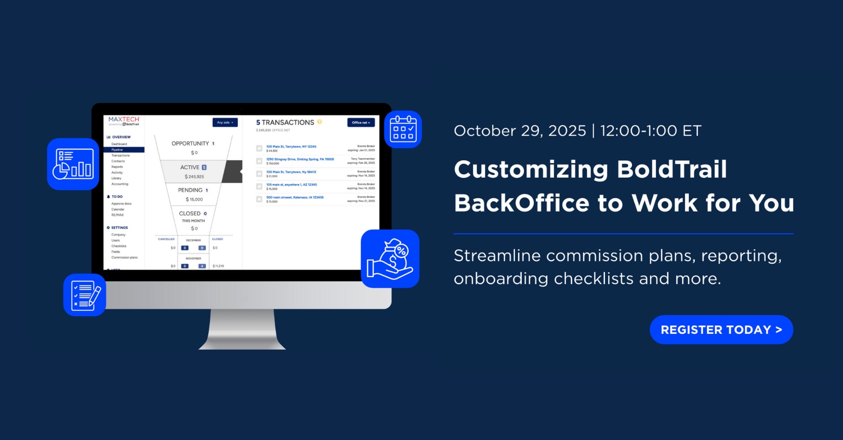 Discover how BoldTrail BackOffice streamlines your brokerage operations by creating efficiency and consistency across every transaction. In this free webinar, we’ll cover how to set up required fields and transaction checklists to ensure uniform processes, and how to use your built-in to-do list to stay on top of document approvals with ease.