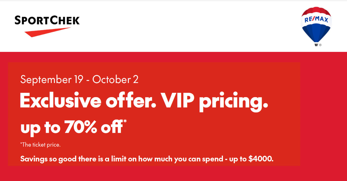 Check your inbox for an email sent by RE/MAX Canada on Sept. 19 with the subject “Exclusive VIP Pricing at Sport Chek for RE/MAX | Up to 70% Off* Sept 19 – Oct 2” to find your unique discount code and redeem at checkout.