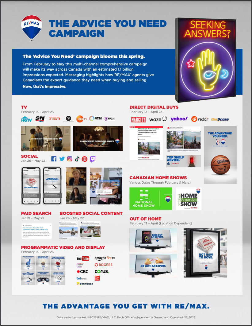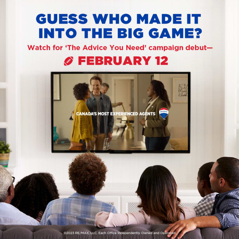 Us! RE/MAX® Canada’s new 2023 ad campaign, ‘The Advice You Need’ debuts to the country on Feb. 12, 2023 during the most prime real estate ad time— the Super Bowl! Grab some nachos and tune in to watch your team (RE/MAX®) score major points with consumers. The spot features a creative twist which highlights how RE/MAX agents have the advice you need when it comes to buying and selling.