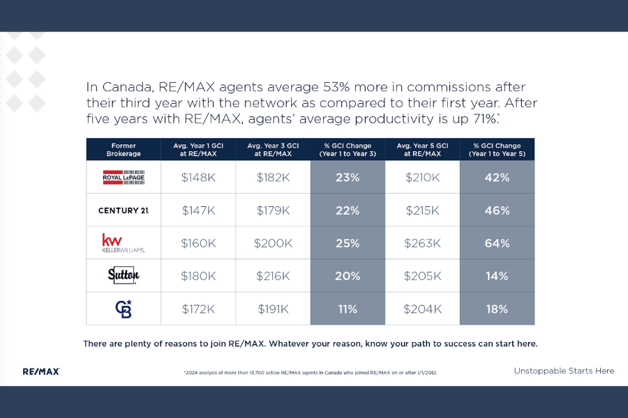 - Big Opportunities: In Canada, RE/MAX agents average 53% more in commissions after their third year with the network as compared to their first year. After five years with RE/MAX, agents’ average productivity is up 71%.***